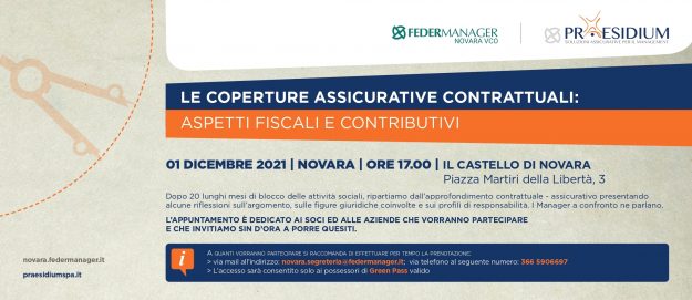 Federmanager Novara-VCO e Praesidium sono gli organizzatori di un importante evento che si terrà Mercoledì 1 Dicembre dalle 17:30 alle 19:30 nella splendida cornice del Castello di Novara sul tema molto attuale e spesso poco conosciuto delle “COPERTURE ASSICURATIVE CONTRATTUALI“.   Dopo 20 lunghi mesi di blocco delle attività sociali, ripartiamo dall’approfondimento contrattuale – assicurativo presentando alcune…